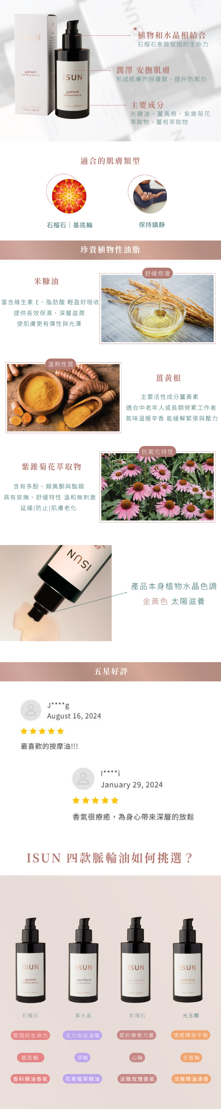 紅色的礦石能量象徵堅固的生命力,紅色的花草根莖植萃與偏香料的精油調配,在按摩同時除了能夠潤澤肌膚,安撫肌膚外,形成肌膚的保護膜,提升表皮的防禦力。