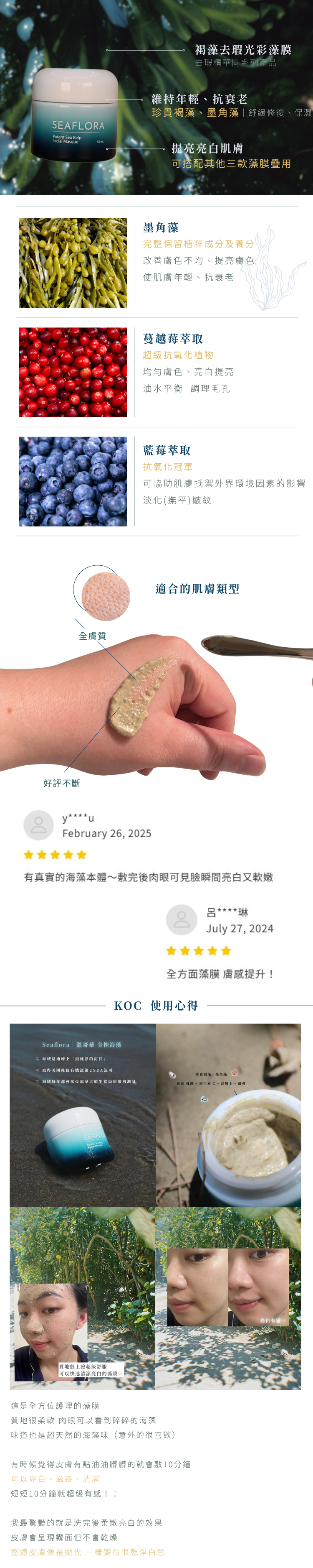 含有珍貴褐藻、墨角藻,添加 紅藻 + 維生素 C + 高嶺土 + 蘆薈。