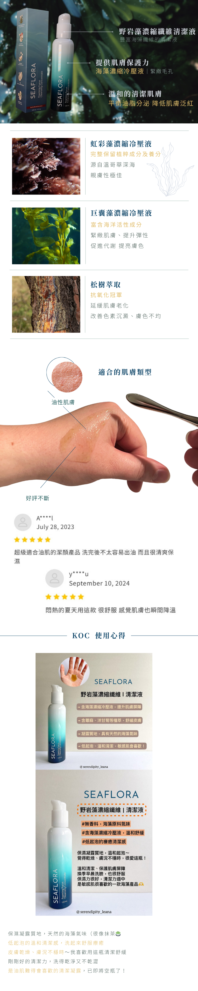 豐富海藻纖維的清潔液,提供肌膚保護力與緊致毛孔,非常溫和的清潔肌膚、平衡油脂分泌與降低肌膚泛紅,各種肌膚適用。