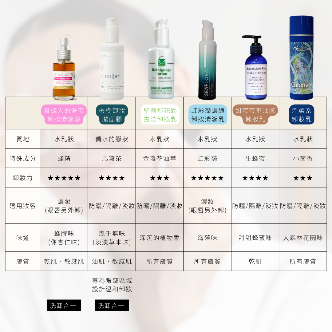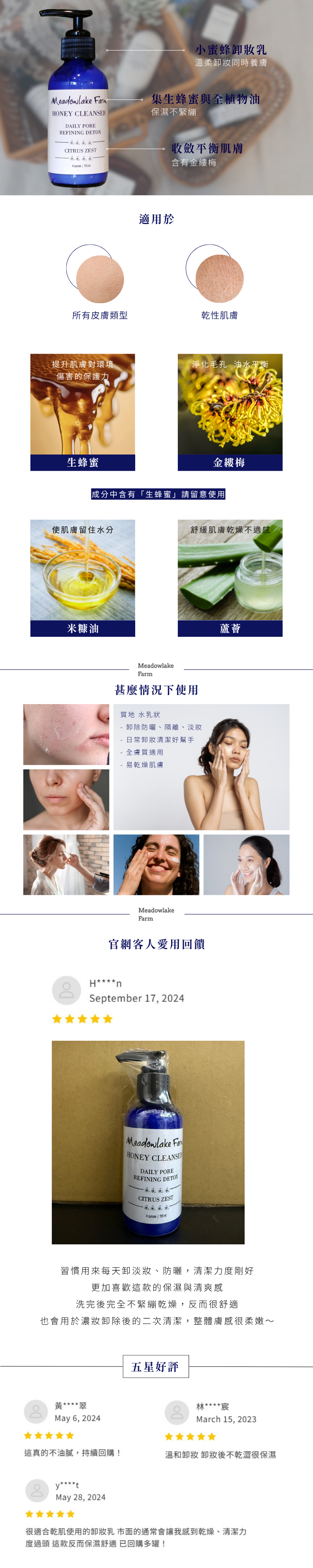 [小蜜蜂卸妝乳],含生蜂蜜與全植物油的護膚滋養加上金縷梅的收斂平衡,取適量於臉部按摩後以溫水洗淨