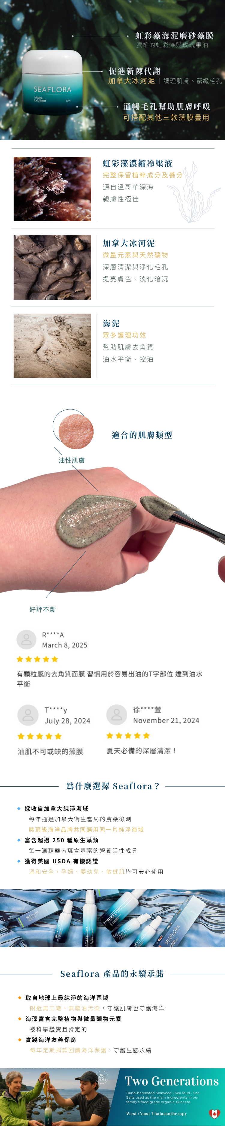 [海泥磨砂面膜]:濃縮的虹彩藻與玫瑰果油,在去角質的同時,也能給予細緻的肌膚呵護,能促進角質更新代謝,通暢毛孔,幫助肌膚呼吸。一週使用一到二次即可。