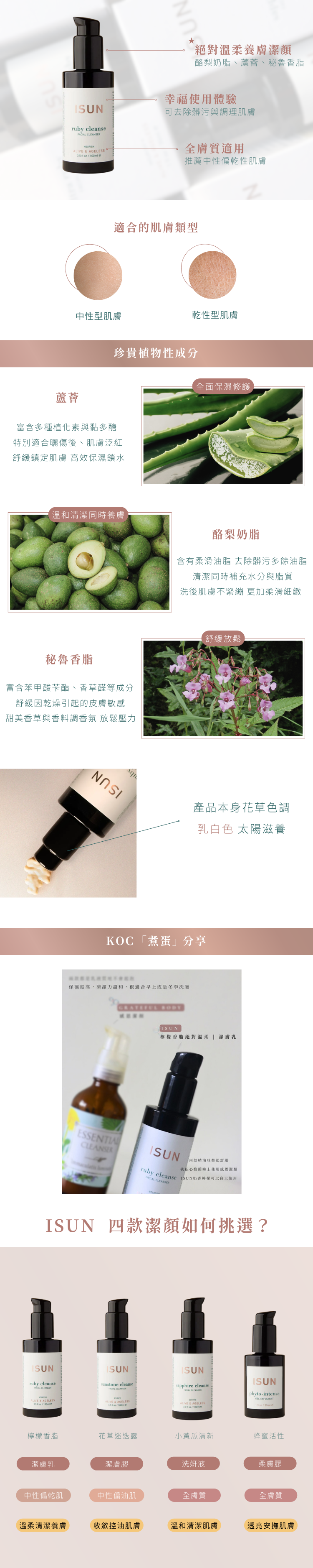 絕對溫柔的保養護膚清潔品。酪梨奶脂、蘆薈、秘魯香脂,適合正常到偏乾性肌膚使用,能帶給使用者超幸福的使用體驗,可去除髒污與調理肌膚。
