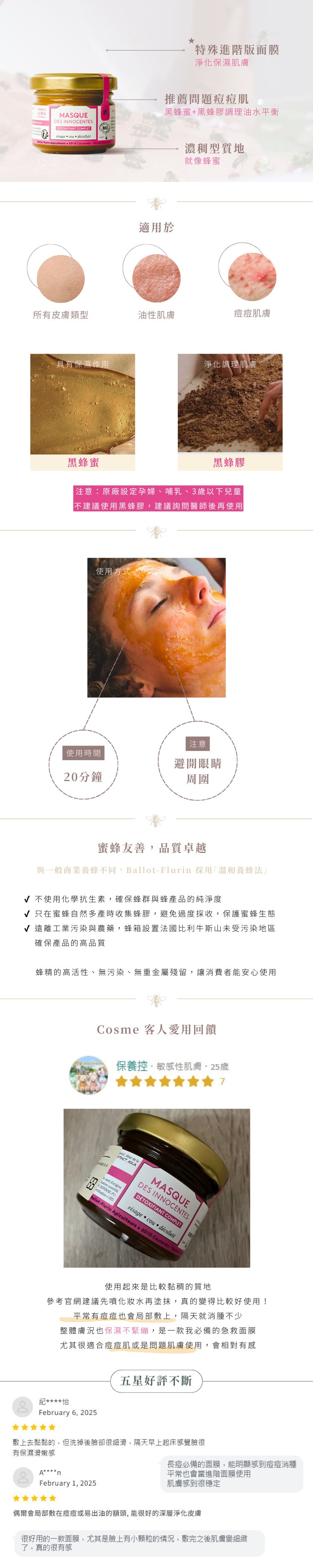 [特殊進階版面膜]:庇裡牛斯山區的黑蜂蜜與黑蜂膠強大結合,帶給肌膚淨化與保濕效果。