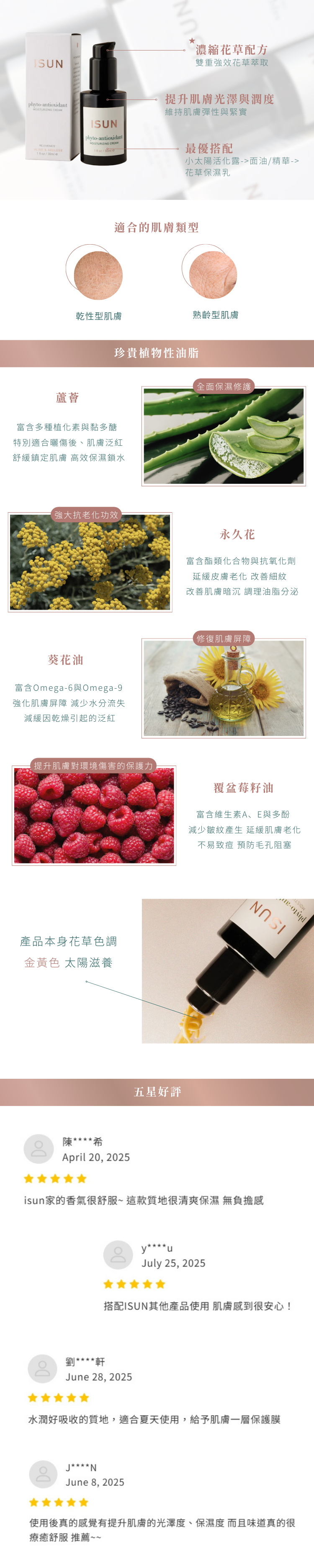 濃縮花草ISUN配方:雙重強效花草萃取。特點為提昇肌膚光澤與潤度,維持肌膚彈性與緊實。