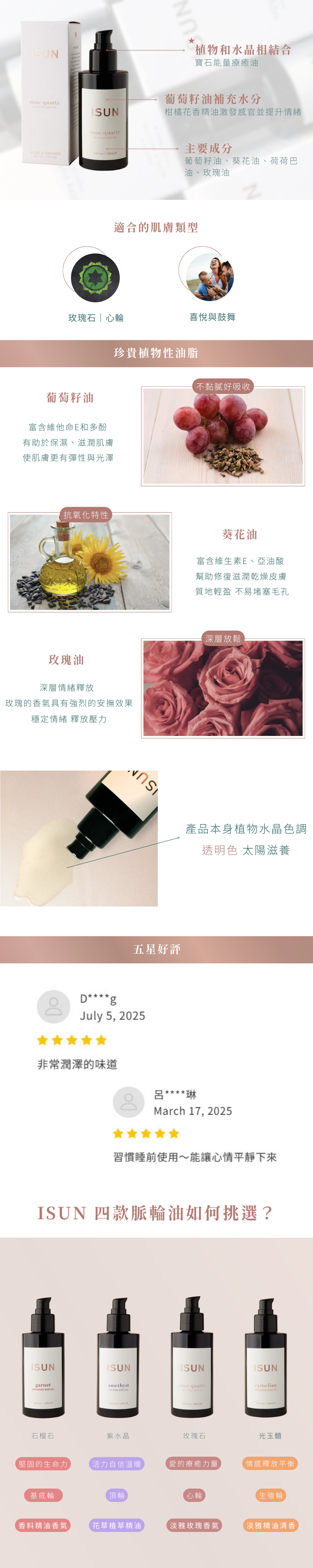*葵花油、大自然花草油萃菁華(*葡萄籽油、*玫瑰花、*薰衣草、夏枯草、*永久花、*德國洋甘菊、*茉莉花、*迷迭香、*忍冬花、蓮花、*枸杞)、百香果油、*荷荷芭油、VE、精油調和(佛手柑、山蒼子、檸檬、葡萄柚、檀香、萊姆、玫瑰木、檸檬香茅、廣藿香、伊蘭、薑、玫瑰、肉桂、橙花、茉莉)迷迭香萃取、玫瑰石
