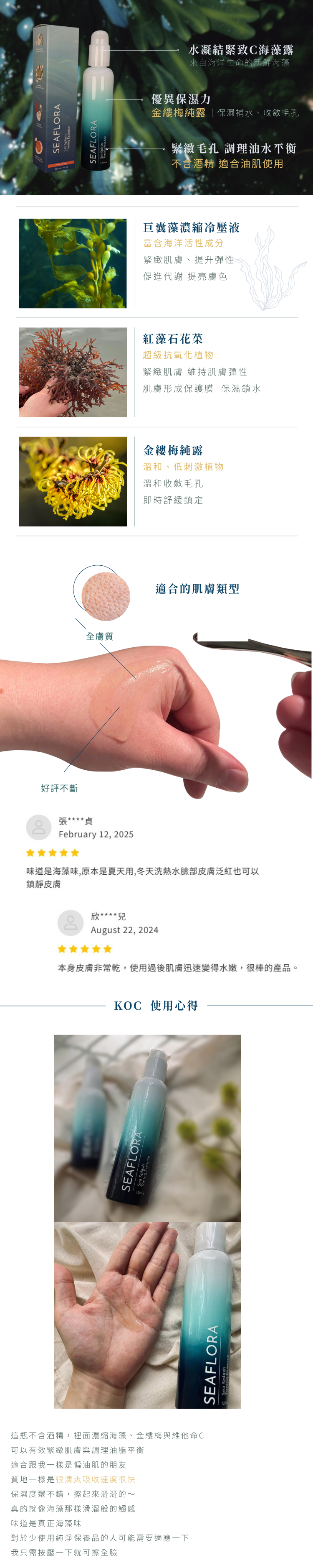 來自海洋生命的新鮮海藻,提供超優異保溼,豐富大海礦物質及微量元素,產品不含酒精,適合各式肌膚每日於清潔後使用。